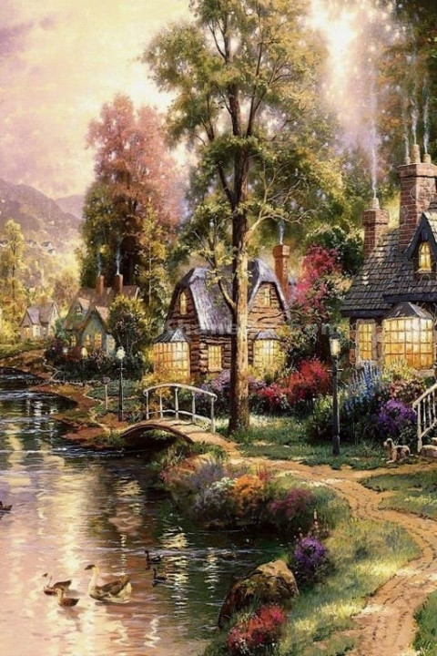 دهکده ای کوچک با گل ها و کوه ها در پس زمینه