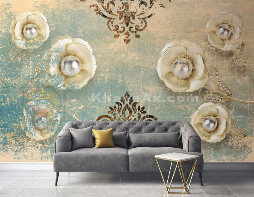 کاغذ دیواری گلدار سفید و طلایی با طراحی